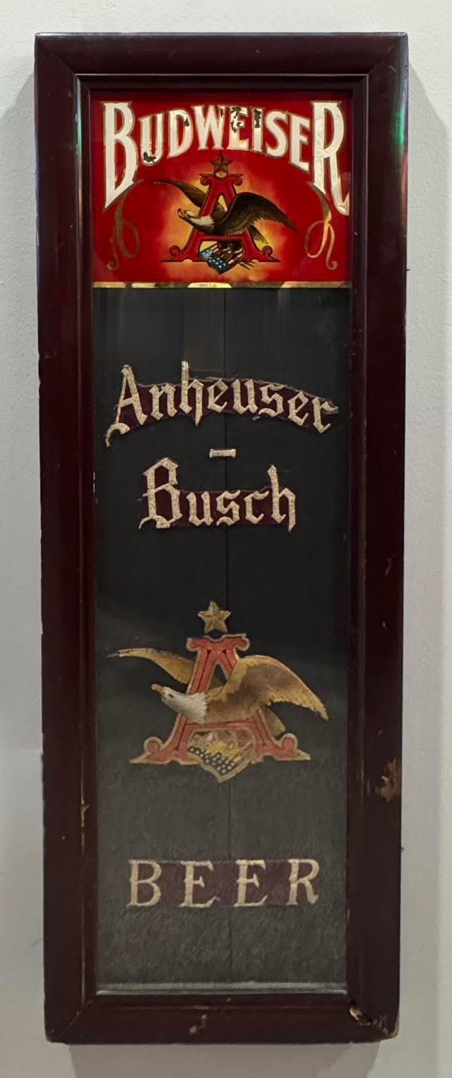 Pre-Prohibition Anheuser Busch license holder. Sign is made of solid wood and holds various felt patches from that time period.
