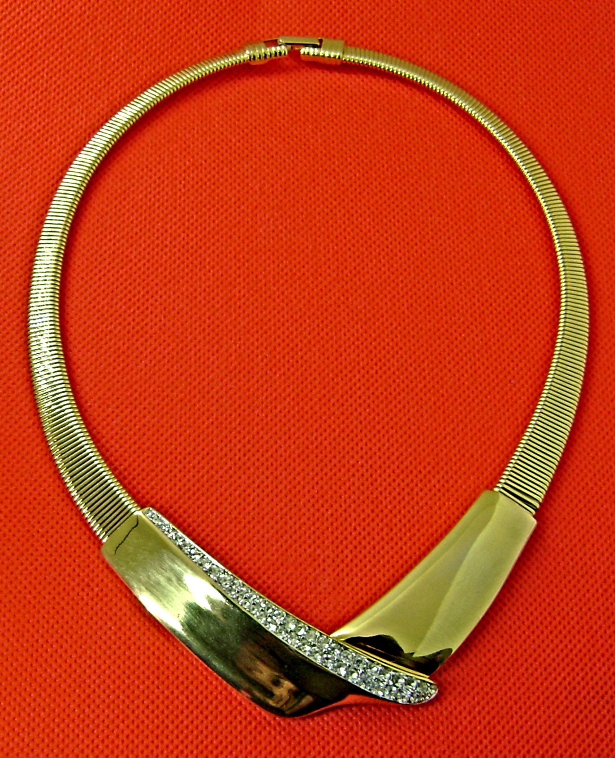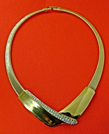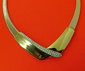 Trifari bib collar necklace. With paved simulated diamonds on polished gold tone. Measures 15". 1980's