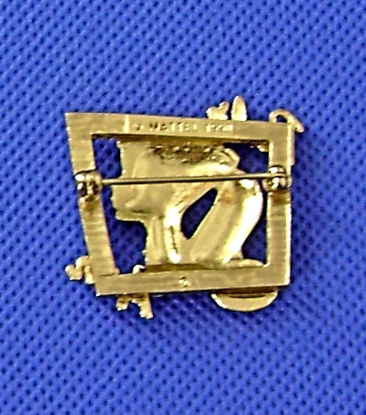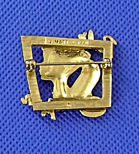Avon loves Barbie brooch. With a likeness of the famous Barbie Doll. Gold tone and rhinestones. 1-1/4" tall. Signed Mattel, 1998.