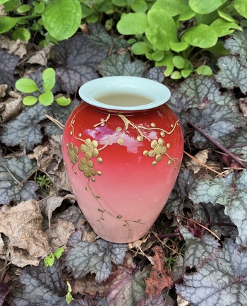 This small vase is made from two layers of cased glass, shaded pink to red over a custard interior, which has a uranium content & glows green under UV light. There is raised gilt decoration of blossoming branches.