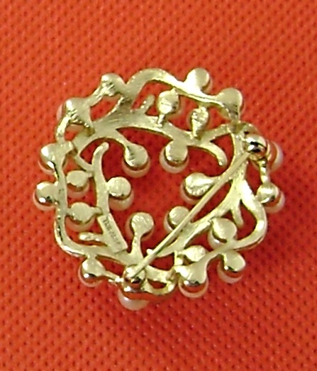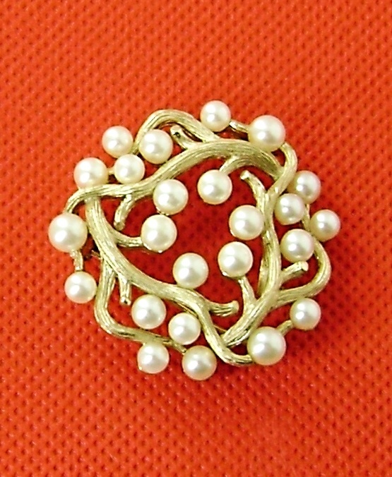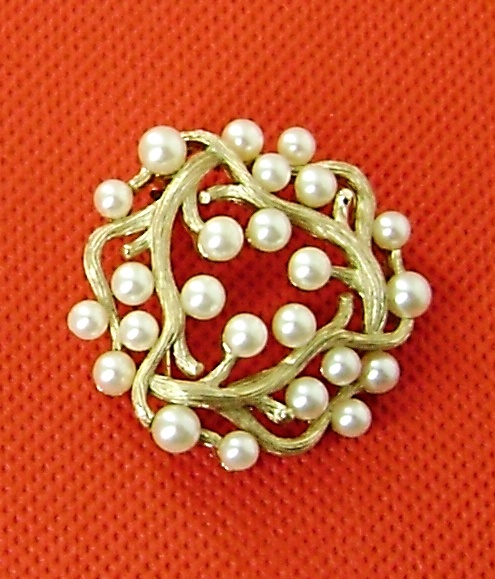 Trifari pearl pin. With intertwining tree branches and simulated pearls. Gold tone. Gems Of The Sea series. 1-1/4". Branches Circle, 1958
