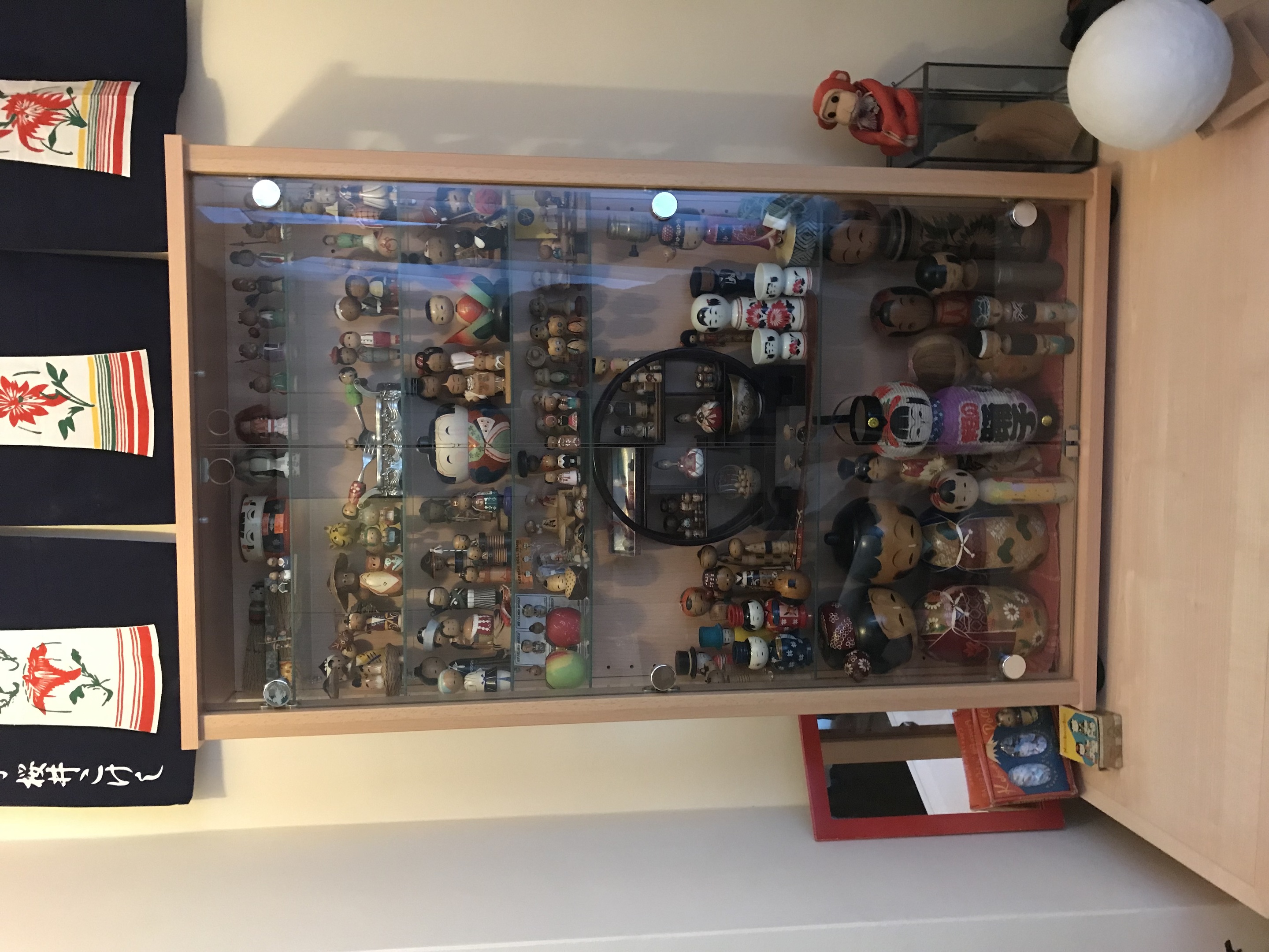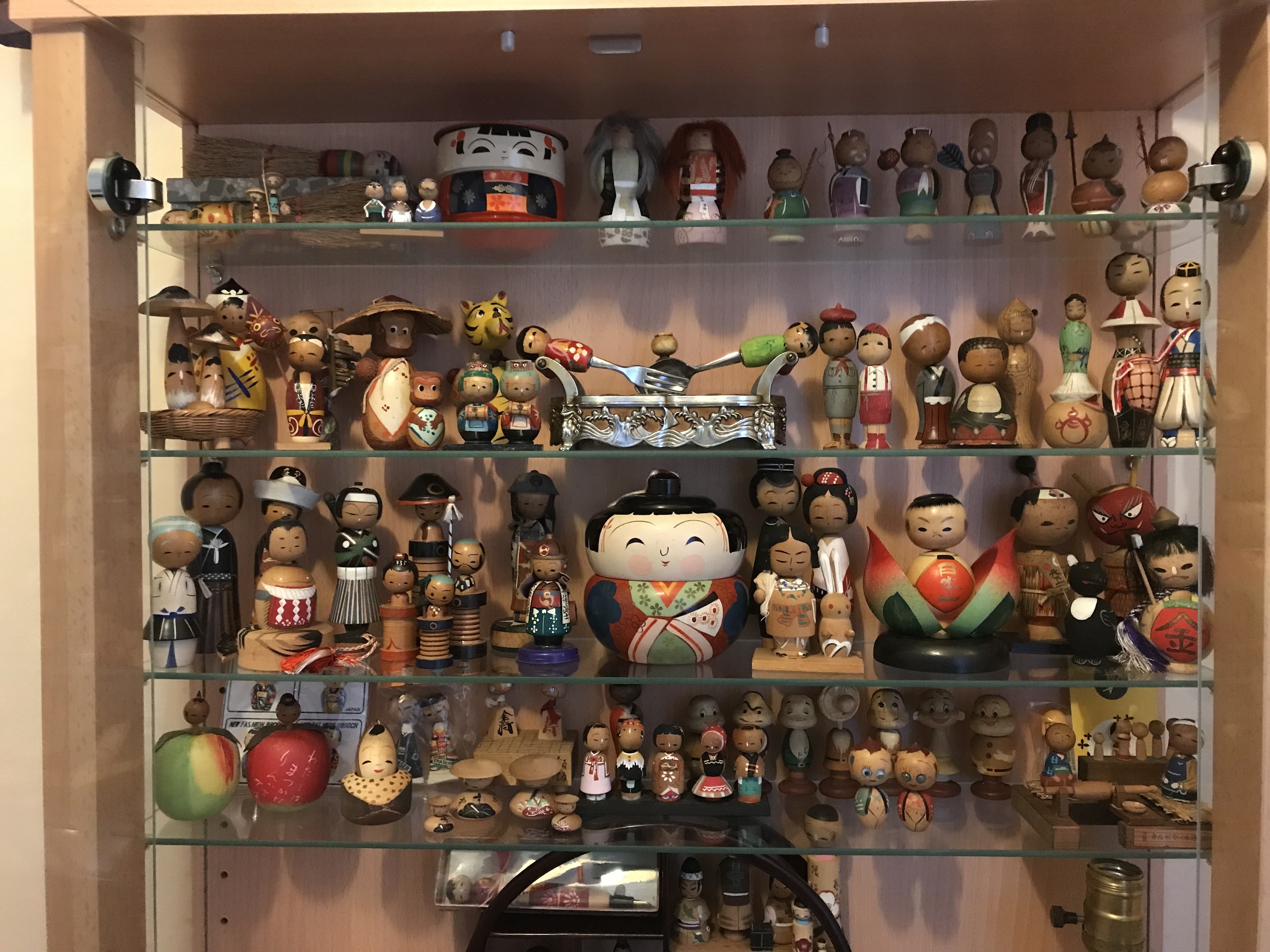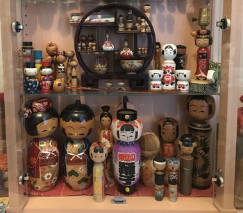 I still have the original cabinet (shown in earlier posts) filled with kokeshi but now have a much larger selection including;