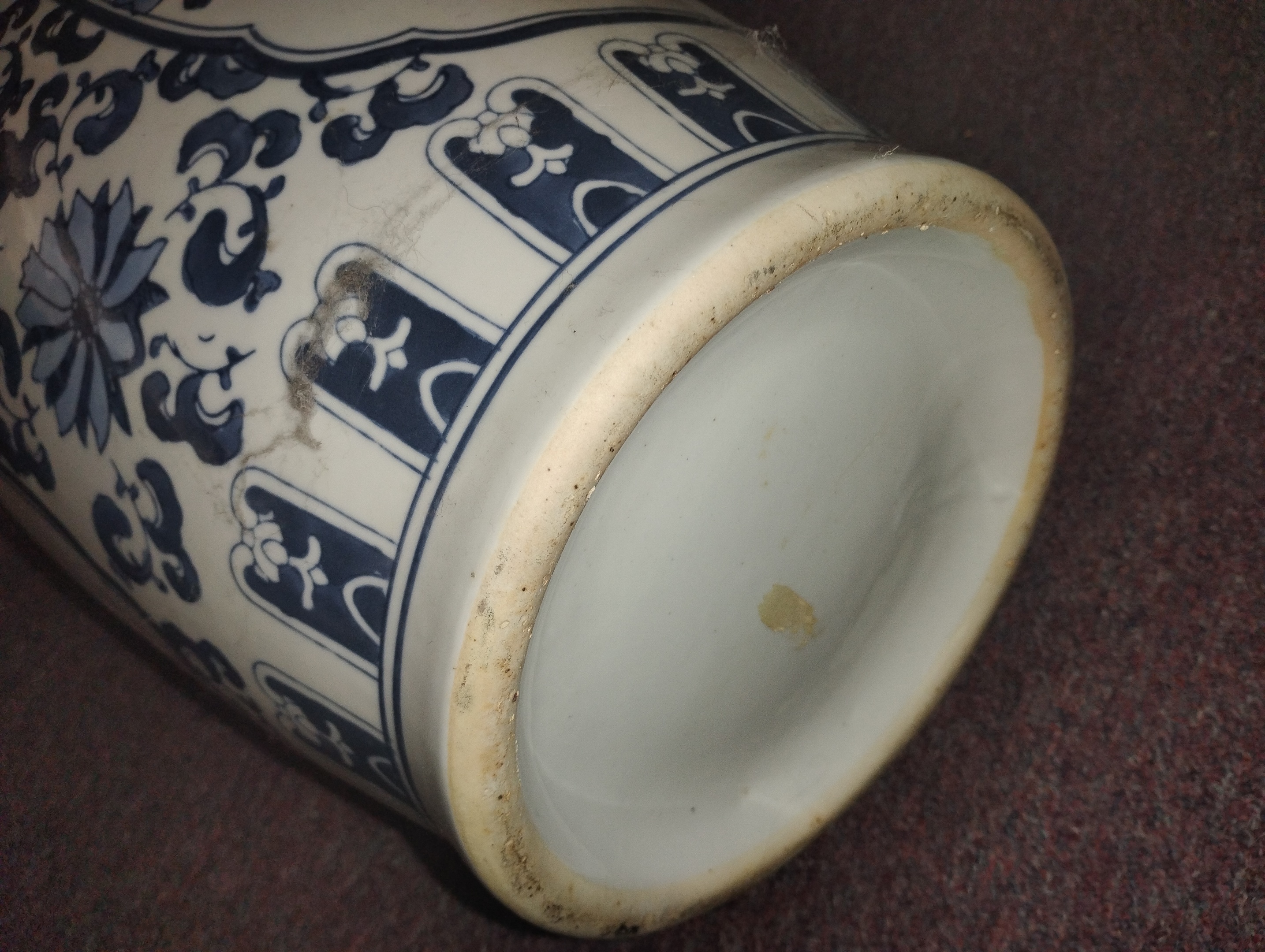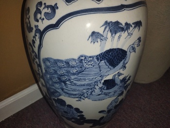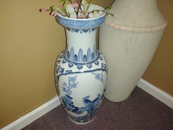 A Beautifully Designed Vase Done In A Peacock Theme Using Cobalt Blue And Lighter Blue Hues. This Measures 25.75" In Height. A Goodwill Purchase. No Makers Mark.