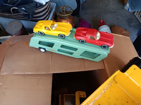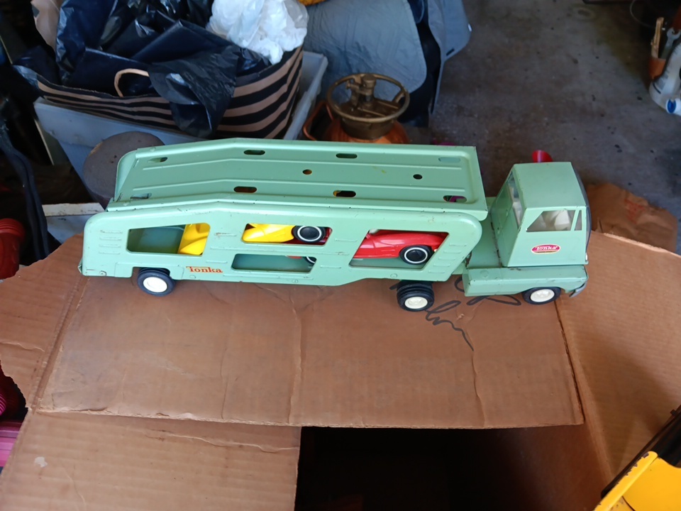 Guy showed me this old Tonka today. It had cars in it. The cars are plastic but seem to fit. The tires line up with the slots on the carrier. Could this steel truck have come with plastic cars or did someone find the right sized cars to fit?
