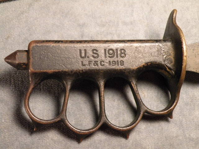 Can't seem to figure this one out. It is agreed to be original but all the 1's we can find have a knife incorporated or slight differences, such as the the upper grip which on this is a sharp point. Given to me by a French friend & kept it hanging on my parking brake handle till I took a good look at it & realized it wasn't a repro.. They were U.S. made & the co. markings are well known. They usually had a knife blade but have found some without it but the sharp tang doesn't match any others. Heavy brass & hell of a weapon.