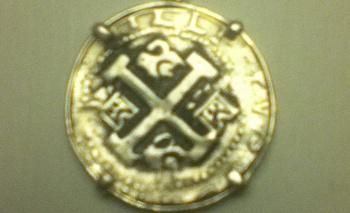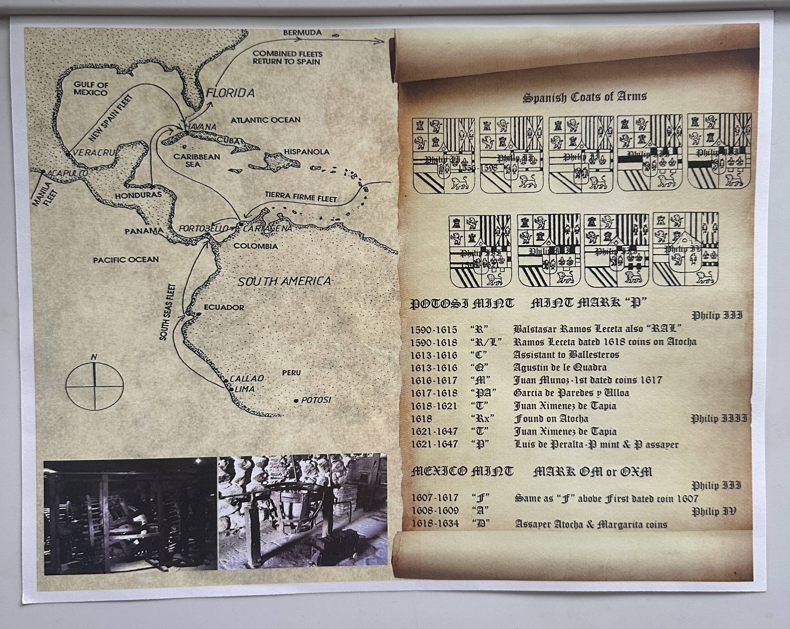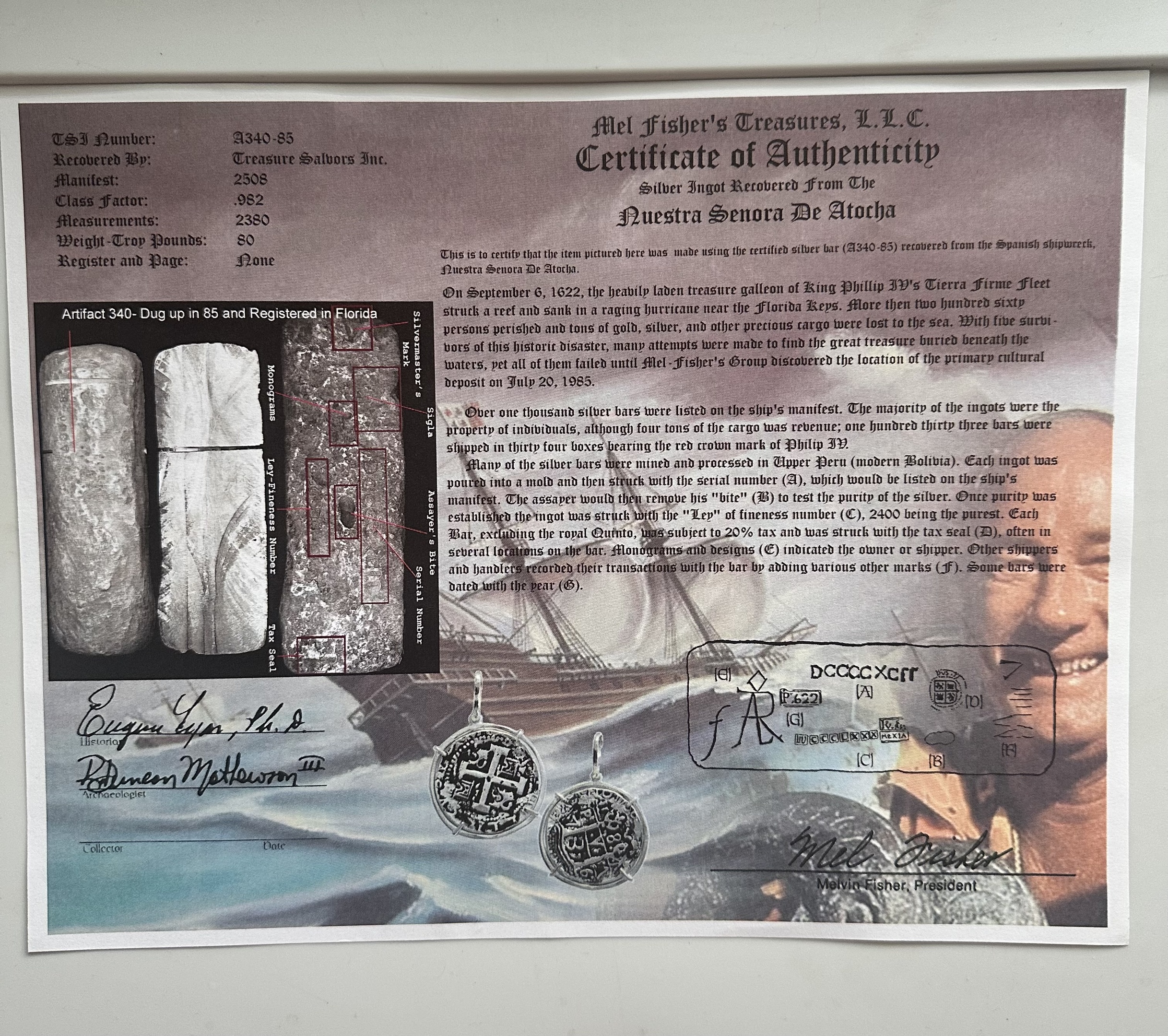 Shown is a coin that was made from a certified silver bar (A340-85) that was on board the Nuestra Señora De Atocha. The ship sunk on September 6, 1622 near the Florida Keys. It was part of King Phillip IV of Spain's Tierra Firme Fleet. The ship was discovered by Mel Fisher's search team on July 20, 1985.