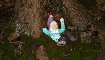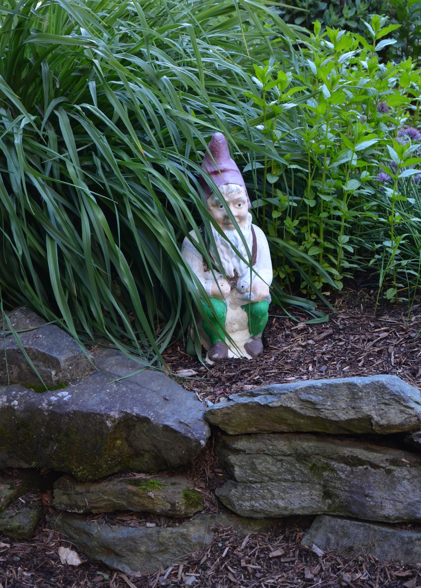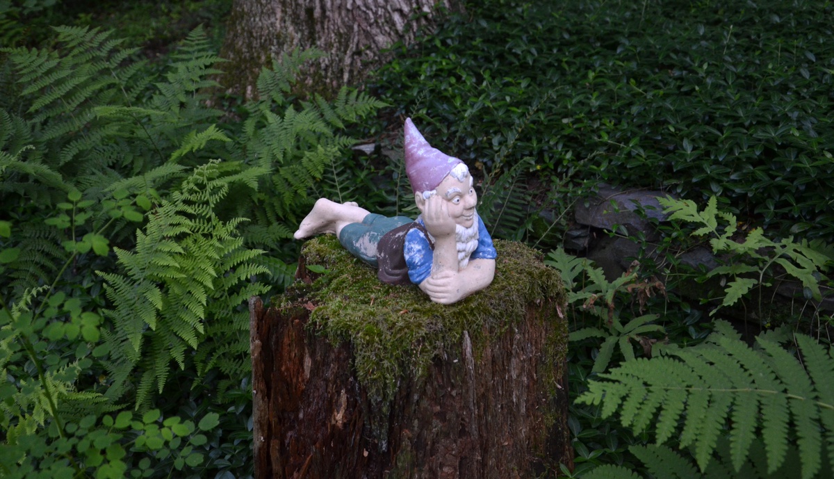 I was driving down a country road and i saw a house with a whole bunch of gnomes in front of it. I turned around and spoke to the owner who sold me these along w/ a few more for a very reasonable price. The last one is kind of spooky, so i hid it in the woods. He's supposed to be on a swing and hanging from something, but he lost a hand. The snail is from my grandparent's yard.