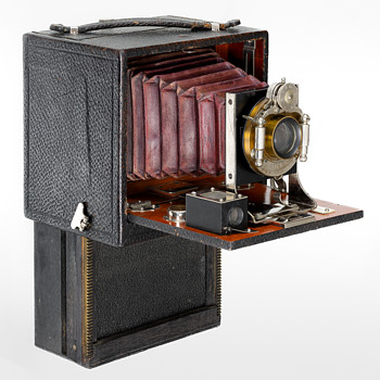 This Chase Folding Magazine Camera is somewhat obscure in the pantheon of American red-bellows self-casing cameras, having only appeared briefly from 1899 to 1901 in 4x5" and 5x7" formats. It is fascinating because the design was an attempt to make shooting glass plates almost as easy as roll film.