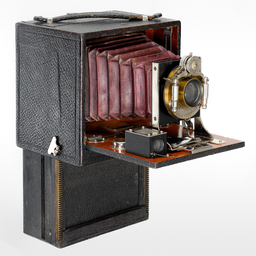 Roll film had the benefit of being easy to use; just take a picture and turn a knob. Plate cameras were cumbersome. So for a very short time, some makers built and sold models with mechanically integrated ‘magazines’. Before shooting, magazines were preloaded with glass plates set into tin sheaths. Changing plates after an exposure was a little easier. However, the changing mechanisms tended to wear and break rather quickly.